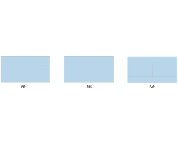 Deux sources de signaux indépendantes peuvent être vues côte à côte sur l’écran en même temps ou affichées en mode PiP dans n’importe quel coin de l’écran. En utilisant PaP, SBS ou PiP, la taille et la position des deux fenêtres peuvent être ajustées.